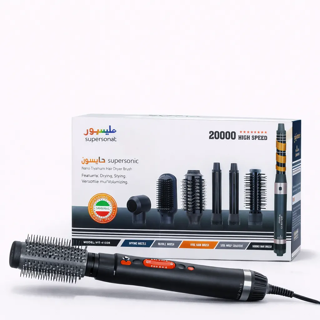 يشمل ملحقات متعددة: تجفيف، مشط حراري، فير، فرش تكثيف/تنعيم، شنطة، كف حراري، مشابك، مشط تقسيم وغيرها
